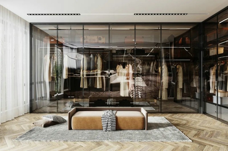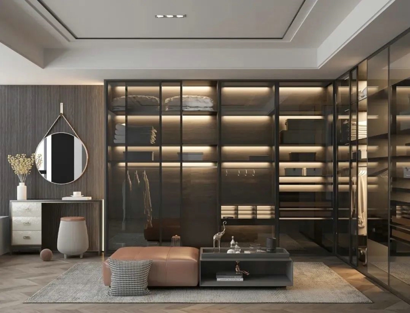 步入式衣帽間,儲(chǔ)放空間完整,深色的木紋與玻璃的搭配,兼具著古典的氣質(zhì)與現(xiàn)代的外觀。